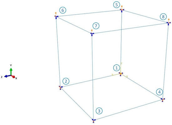 The Isight software was adopted to optimize the material parameters of the hyper-pseudo-viscoelastic model (i.e., the combination of Yeoh, Ogden–Roxburgh and Prony series models) that can describe the tensile recovery mechanical responses (loading curve, unloading curve and permanent set) of rubber. In order to improve the computational efficiency of optimization, an 8-node unit cell model (C3D8RH) was established. The model size is 10 mm × 10 mm × 10 mm. Tensile recovery displacements in the vertical direction acted on nodes 5, 6, 7 and 8. The other four nodes 1, 2, 3 and 4 were fixed in the simulation as shown in Figure 8. After calculation, the reaction force (RF2) vs. displacement (U2) curve for the unit cell was obtained. Then the force vs. displacement data was postprocessed to be stress vs. strain data.