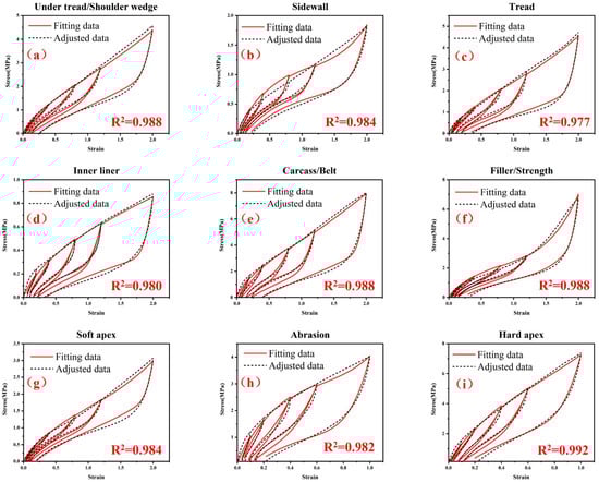 Comparison between the adjusted stress–strain data and the fitting results using the final optimized material parameters of the hyper-pseudo-viscoelastic constitutive model for the nine rubber materials in TBR tires: (a) under tread and shoulder wedge, (b) sidewall, (c) tread, (d) inner liner, (e) carcass rubber and belt rubber, (f) filler rubber and strength rubber, (g) soft apex, (h) abrasion and (i) hard apex.