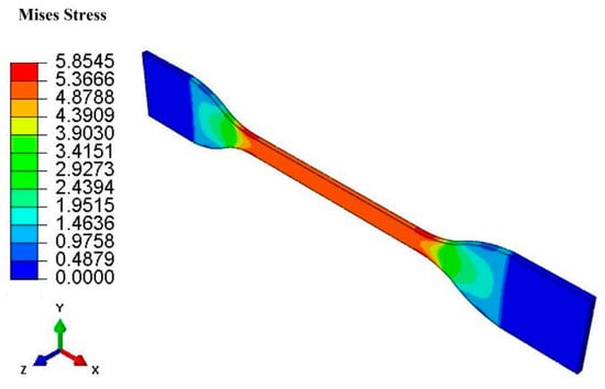 In the finite element model, the thickness of the three-dimensional dumbbell-shaped rubber specimen is set to 1 mm. The width and length of the middle working area is 4 mm and 25 mm, respectively. The model is composed of 13,068 elements. The element type of the model was an 8-node linear hybrid, constant pressure and reduced integration brick element with enhanced hourglass control (i.e., C3D8RH in Abaqus nomenclature). Tensile recovery of the hard apex dumbbell-shaped specimen with three different peak strain levels (10%, 20%, and 40%) was simulated. The contour plot of the Mises stress obtained at the peak strain of 40% is shown in Figure 11.