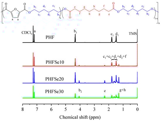 The chemical structure and composition of PHF and PHFSe copolyesters were first determined with 1H NMR. Figure 1 depicts the related 1H NMR spectra. As shown in Figure 1, for the PHF homopolyester, the signal at 7.19 ppm was from the proton a of the furan ring, while the signals at 4.33 ppm, 1.78 ppm, and 1.48 ppm were from the protons b1, c1, and d1, respectively, of the hexamethylene 2,5-furandicarboxylate unit. In addition, for PHFSe copolyesters, the signals at 4.06 ppm (from the proton b2) and 1.60 ppm (from the protons c2 and d2) were from HDO in the HSe unit, while the signals at 2.28 ppm (from the proton e), 1.38 ppm (from the proton f), and 1.30 ppm (from the protons g and h) were from SeA in the HSe unit. The composition of PHFSe copolyesters was acquired by the integral ratio of a from DMFD and e from SeA. The compositions of the HSe unit in the as-synthesized copolyesters were calculated to be 10, 19, and 29 mol%, respectively. Since the molar ratios of HF/HSe were almost the same as those of DMFD/SeA, PHFSe copolyesters were successfully prepared. For convenience, the three copolymers were abbreviated as PHFSe10, PHFSe20, and PHFSe30, respectively, in terms of the feed molar ratio. The [η] of PHF and PHFSe copolyesters was calculated using the Solomon–Ciuta equation [], and the [η] values of PHF, PHFSe10, PHFSe20, and PHFSe30 were 0.63, 0.68, 0.62, and 0.63 dL/g, respectively. The similar [η] values indicate that PHF and PHFSe copolyesters showed relatively high and similar molecular weights. The above data are recorded in Table 1.