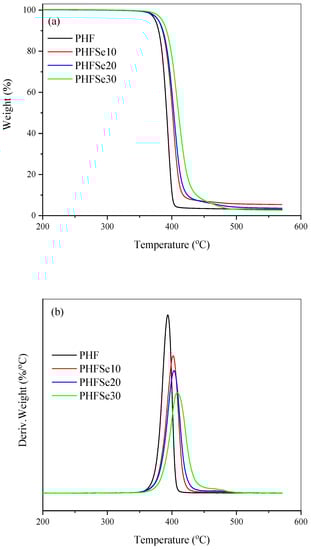 Thermal stability study of PHF and PHFSe copolyesters: (a) TGA and (b) DTG curves.