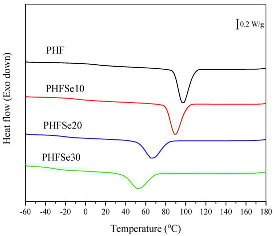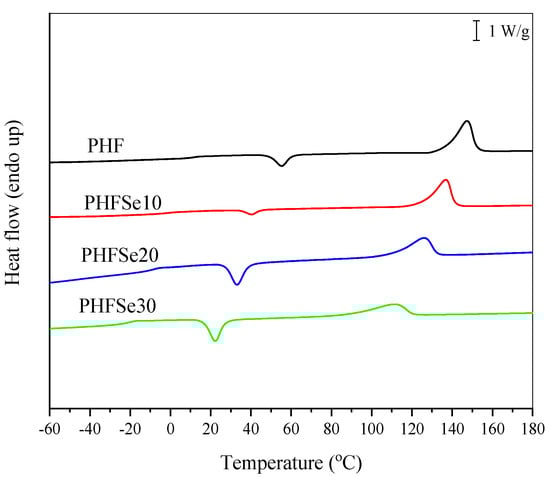 In this section, the basic thermal behavior of PHF and PHFSe copolyesters was studied with DSC. Figure 3 shows the DSC traces of PHF and PHFSe copolyesters at a heating rate of 20 °C/min after a melt-quenching process. The Tg of PHF was 12.3 °C, while the Tg of PHFSe copolyesters obviously shifted downward to a low temperature range with increasing the HSe unit content due to the increased the chain mobility. Both PHF and PHFSe polyesters showed the cold crystallization and subsequent melting behavior during the second heating process. The cold crystallization temperature (Tch) of PHF was 55.4 °C, while it gradually changed to 40.4 °C, 33.1 °C, and 22.3 °C for PHFSe10, PHFSe20, and PHFSe30, respectively. The cold crystallization enthalpy (ΔHch) values were also measured. In addition, the Tm of PHFSe30 significantly decreased to 111.2 °C; furthermore, the melting enthalpy (ΔHm) decreased from 48.1 J/g for PHF to 35.3 J/g for PHFSe30 due to the copolymerization. As a result, the thermal properties of PHF may be obviously influenced and easily adjusted through copolymerization with SeA as the third comonomer in this research.