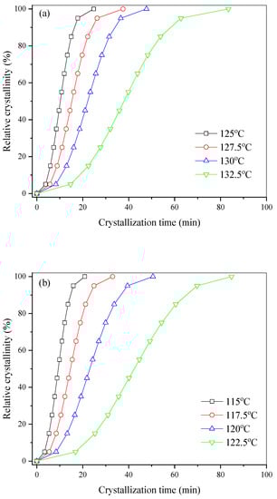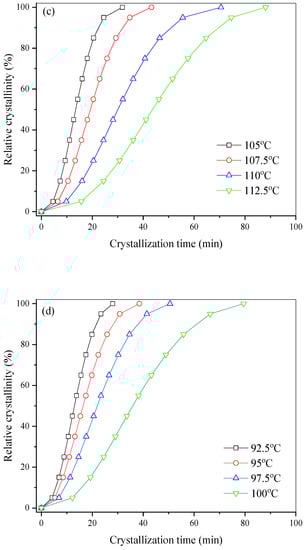 The calculated t0.5 data are also shown in Table 3. For each sample, t0.5 gradually increased with the increase in Tc, indicating that the increase in Tc decreased the crystallization rate.