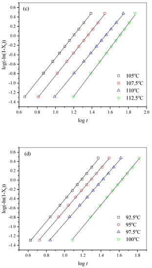 where n is the Avrami exponent, and k is the crystallization rate constant related to both nucleation process and crystal growth [,]. The Avrami plots are displayed in Figure 6. The almost-parallel straight lines indicated that the Avrami method fitted the isothermal melt crystallization process of all the samples very well.