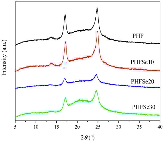 The influence of HSe unit on the crystal structure of PHF was studied by wide-angle X-ray diffraction (WAXD). Figure 8 illustrates the WAXD profiles. PHF showed three characteristic diffraction peaks at 2θ = 13.6°, 17.0°, and 24.7°, respectively. In the case of PHFSe copolyesters, they displayed similar WAXD profiles to PHF, suggesting that the presence of HSe unit did not modify the crystal structure of PHF. At present, it is not certain whether the HSe units are totally excluded from the PHF crystals or are partly included into the PHF crystals. Further investigation is necessary to address this issue and will be reported in forthcoming research. In addition, the crystallinity (Xc) of each sample was estimated from Figure 8. The Xc values of PHF, PHFSe10, PHFSe20, and PHFSe30 were about 43%, 33%, 23%, and 20%, respectively, revealing again that the copolymerization with SeA reduced the crystallinity of PHF.