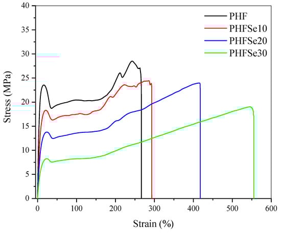 Stress–strain curves of PHF and PHFSe copolyesters.