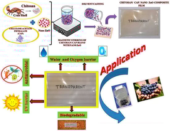 - Indumathi, M.; Sarojini, K.S.; Rajarajeswari, G.J. Antimicrobial and biodegradable chitosan/cellulose acetate phthalate/ZnO nano composite films with optimal oxygen permeability and hydrophobicity for extending the shelf life of black grape fruits. Int. J. Biol. Macromol. 2019, 132, 1112–1120. [Google Scholar] [CrossRef] [PubMed]