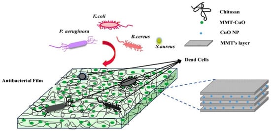 - Nouri, A.; Yaraki, M.T.; Ghorbanpour, M.; Agarwal, S.; Gupta, V.K. Enhanced Antibacterial effect of chitosan film using Montmorillonite/CuO nanocomposite. Int. J. Biol. Macromol. 2018, 109, 1219–1231. [Google Scholar] [CrossRef]
