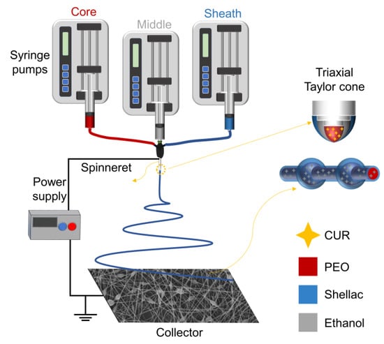 The core fluid (PEO–CUR) was obtained from 0.5 g PEO and 0.05 g CUR dissolved in 10 mL of 80% aqueous ethanol. The middle fluid was ethanol. The sheath fluid was obtained from 3 g shellac dissolved in 10 mL of ethanol. In the above three fluids, the middle and sheath fluids are unspinnable.