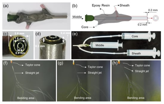 Homemade triaxial spinneret and electrospinning implementation process. (a,b) Photograph and schematic diagrams of homemade triaxial spinneret; (c,d) photographs of the spinneret tip; (e) the connection between spinneret and syringe; (f–h) the electrospinning process for F1, F4, and F7 fibers.