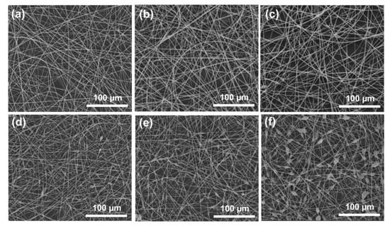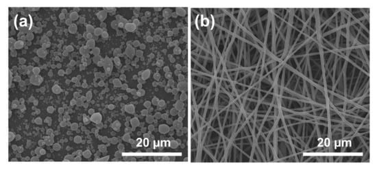 The development of advanced nanomaterials depends not only on the composition of the matrix but also on the external shape and internal structure [,]. By changing the external shape and internal structure of nanomaterials, there is potential to change the properties of the nanomaterials and develop novel functional materials []. The beads-on-the-string (BOTS) fibrous morphology is composed of the two most common shapes (fiber and particle) of functional nanomaterials, i.e., particles are arranged axially along the fibers [,]. BOTS fibers can effectively integrate the advantages of fibers and particles and realize the unification of external shape and internal structure [,].