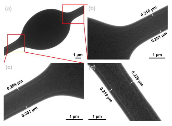 Figure 5 shows the TEM images of F7. Figure 5a shows the bead segment of F7. Figure 5b,c show a partially enlarged view of Figure 5a. From the TEM images of Figure 5b,c, it can be observed that the junction of the fiber and the bead has a core–sheath boundary, and the sheath thickness is about 0.21 ± 0.01 µm. It was deduced that the beads also had a core–sheath structure. The fiber segment of F7 is shown in Figure 5d. It can be clearly observed from the TEM image that the fiber has a core–sheath structure, and the sheath thickness is about 0.22 ± 0.01 µm.