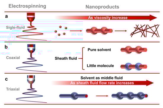 During the preparation of nanoproducts by single-fluid electrospinning, nanoparticles, BOTS fibers, and linear cylindrical fibers can be obtained, respectively, as the viscosity of the working fluid increases (Figure 6a). The modified coaxial electrospinning is able to prepare monolithic BOTS fibers by using solvent as the sheath fluid []. When the sheath fluid is a small molecule polymer, BOTS core–sheath electrospun fibers can be prepared []. This is because the small molecule fluid in the sheath is unable to uniformly encapsulate the core fluid during the electrospinning process. Subsequently, the sheath fluid gradually shrinks under the interfacial tension, and it forms beads with a core–sheath structure. However, the fiber segment of the fibers is a monolithic structure (Figure 6b). This study innovatively used solvent as the middle fluid in the triaxial electrospinning. It effectively isolates the core and sheath fluids and changes the interfacial tension between the core and sheath fluids. Moreover, as the flow rate of the unspinnable sheath fluid increases, the number of beads gradually increases. This method makes it possible to stably prepare BOTS fibers with a core–sheath structure (Figure 6c).
