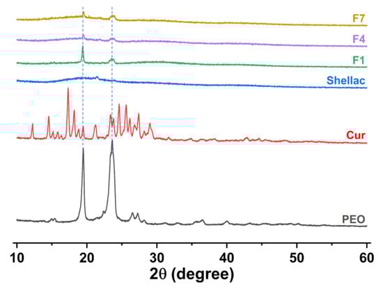 Figure 7 shows the physical form of the raw materials (CUR, PEO, and shellac) and fibers (F1, F4, and F7) assessed by XRD patterns. The shellac is an amorphous material because it lacks sharp Bragg reflections in the XRD pattern. PEO is a semi-crystalline material, which has two distinctive peaks at about 2θ = 19° and 2θ = 23°. The CUR has many distinct sharp peaks, indicating that it is a crystalline material. F1, F4, and F7 retained the characteristic peaks of PEO at about 2θ = 19° and 2θ = 23°, and no other peaks were observed. The results indicated that most of the crystal structure of PEO was transformed into amorphous forms after the electrospinning process. No characteristic peaks of CUR were observed in F1, F4, and F7 fibers, indicating that CUR exists in the drug-loaded fibers in an amorphous form.