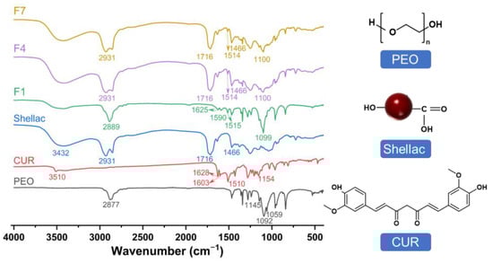 The typical characteristic peaks of CUR in the FTIR spectra of F1 shifted and even disappeared. This phenomenon indicates that CUR and PEO form a molecular composite, i.e., there is good compatibility between them. The characteristic peaks of CUR in F4 and F7 also shifted and disappeared. The main characteristic peaks of the shellac were retained, which implied the formation of the core–sheath structure. The molecular formula of the raw materials is shown in Figure 8. It indicates that hydrogen bonds may be formed between C=O in CUR as a proton acceptor and -OH in PEO as a proton donor. Hydrophobic interactions may occur between the benzene ring in the CUR and the long carbon chain of the PEO. These secondary interactions can effectively promote compatibility between the drug and matrix, thus improving their homogeneity and stability.