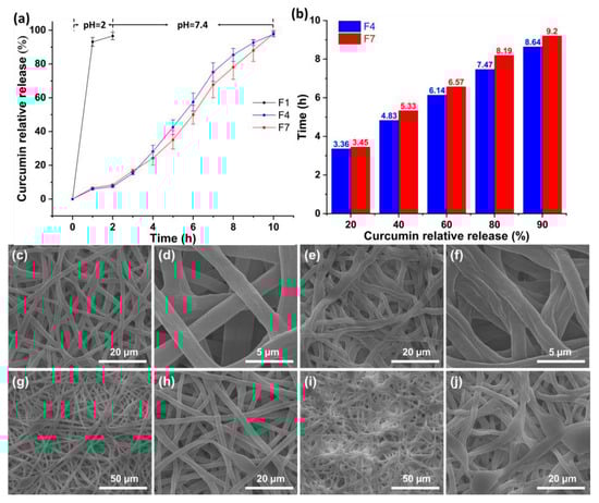 (a) Colon-targeted drug release profiles of fibers; (b) the time required for the certain CUR relative release of F4 and F7 microfibers; SEM images of F4 and F7 microfibers after drug release under simulated intestinal fluid: (c,d) F4 after 1 h; (e,f) F4 after 3 h; (g,h) F7 after 1 h; (i,j) F7 after 3 h.