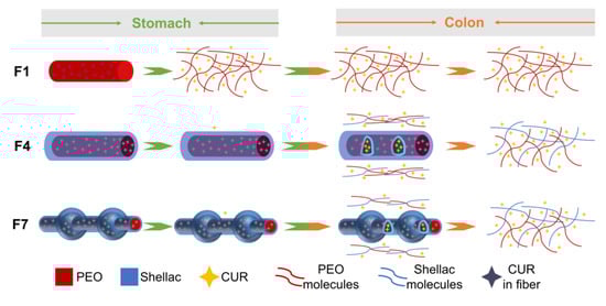 Most traditional drug delivery systems control the release mechanism by selecting different matrices. However, with the continuous development of nanomaterials, the preparation of complex nanostructures enables attempts to provide advanced drug delivery systems. The drug release mechanisms of F1, F4, and F7 fibers are shown in Figure 10. The burst release of water-insoluble CUR from the F1 nanofibers in the simulated gastric fluid is due to the water-soluble matrix PEO. The sheath layer of shellac is a pH-sensitive biomaterial that leads a small number of CUR molecules to be released from the F4 and F7 microfibers in the simulated gastric fluid. With the dissolution of shellac, CUR molecules were gradually released from core–sheath linear F4 microfibers in simulated intestinal fluid. The core–sheath BOTS F7 microfibers also prevented the release of CUR molecules in simulated gastric fluid. The beads in F7 act as a drug reservoir in simulated intestinal fluid to prevent premature leakage of CUR, thus providing a better-sustained release. Therefore, F7 microfibers provide a zero-level release profile in simulated intestinal fluid. Compared with core–sheath linear fibers, core–sheath BOTS fibers can be considered a novel material. Thus, it provides an interesting idea for the development and application of nanomaterials. Based on the protocols reported here, the capability of multi-fluid electrospinning in tailoring the shape and inner structure of fibers [,,,] can be further combined with new therapeutical strategies and new active/inert components in the literature [,,,,,,] for developing more medicated materials.