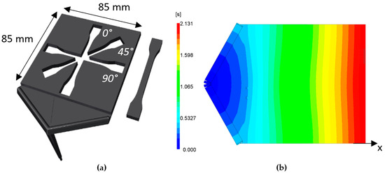 Plate mould geometry showing (a) the production of tensile bars (ISO 527-1BA) under different orientations for material characterisation and (b) the filling time of the plate, indicating a parallel flowing front during injection moulding process.