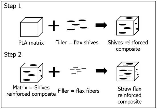 The Mori–Tanaka micromechanics approach is selected to determine the elastic properties. Since straw flax consists of flax fibres and shives, the composite is considered to be a three-phase system [40]. The different phases are illustrated in Figure 2. The first step considers the composite made of neat PLA and flax shives. In the second step, this composite is reinforced with flax fibres. In each step, the individual elastic properties and dimensions of both reinforcing components are taken into account.