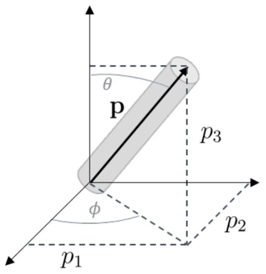 Subsequently, the effect of the fibre orientation on the elastic properties is evaluated. During injection moulding, the short fibres are immersed in a highly viscous polymer melt. The final orientation distribution of the fibres is determined by the rheological behaviour of the compound and by the injection moulding process conditions. The orientation of the fibres is described by the probability distribution function . In this function, the orientation of the fibres is associated with unit vector . The components of are related to the angles and , as shown in Figure 3 [40].