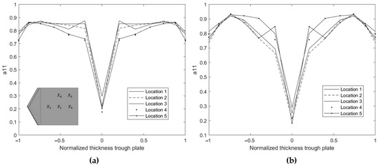 Orientation distribution for a11 through the (normalized) thickness of the plate at different locations, obtained via Moldflow simulations for (a) PLA10FF and (b) PLA20FF.