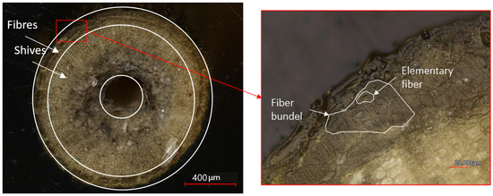 Figure 5 presents the interior structure of a flax stem before processing. The elemental fibres are located in the outer layer of the flax stem, while the flax shives are located in the core of the stem. This observation is in line with the literature [23].