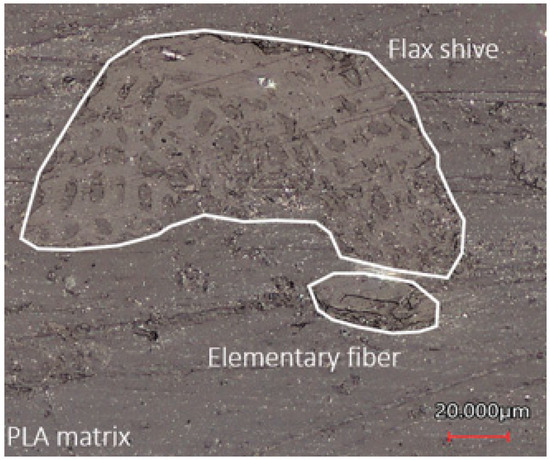 Fibre breakage and splitting of shives and fibres occur due to the high shear forces during processing [24]. This results in flax shives and elementary fibres separately present in the composite. The microscopic image in Figure 6 shows the cross-sectional area of the composite after injection moulding. The impregnation of the PLA matrix within the hollow structure of the flax shives is visible.
