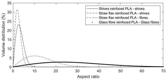 The aspect ratio distribution for shives and fibres is shown in Figure 7. Gravimetric separation of shives and fibres (1.5 g/cm3 and 1.237 g/cm3, respectively [23]) allows the evaluation of their aspect ratio separately. Both number and volume-based distributions of the aspect ratio can be used to analyse the fibre breakage during processing. However, earlier studies indicate that the distribution by volume of the fibres is preferred, as this parameter is most representative of the volume fraction of the reinforcements and, therefore, of the mechanical reinforcement properties [22,24,38]. Therefore, volume-based distribution is reported in this study.