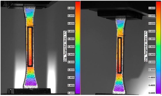Stereo-vision DIC measurement on tensile bar with defined region for averaging of strain to determine the Poisson’s ratio.