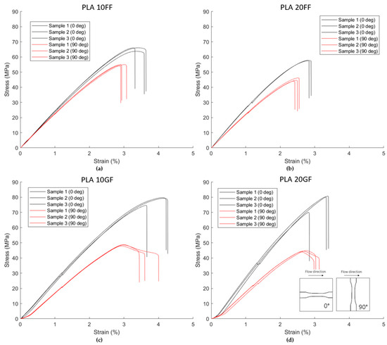 Tensile stress–strain curves in longitudinal and transversal direction according to ISO 527-1BA for (a) PLA10FF, (b) PLA20FF, (c) PLA10GF and (d) PLA20GF.