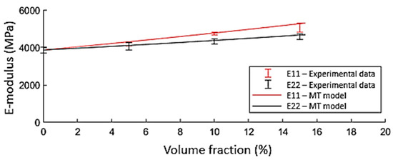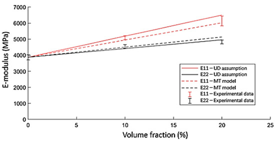 The literature on the effect of flax shives on a PP matrix indicates that a micromechanics-based model is well suited to determine the elastic properties of the composite [23]. No experimental data on the mechanical properties of flax shives are currently available in the literature. To obtain the stiffness of the flax shives used within this study, a micromechanics-based reverse engineering approach is applied. Due to the low aspect ratio of the flax shives, the effect of the varying orientations trough thickness is negligible. Therefore, a generalised two-phase Mori–Tanaka approach for unidirectional (UD) is used. The error between the predicted tensile modulus using the generalised Mori–Tanaka homogenisation approach and experimental data for the tensile modulus in both longitudinal and transversal directions at different volume fractions was minimised. The minimisation of the cost function in Equation (20) is obtained by a nonlinear optimisation function in MATLAB. By optimising the cost function, a stiffness of 22.2 GPa was found for the shives. Figure 10 indicates the correlation between the experimental values and the predictive model optimised according to these data.