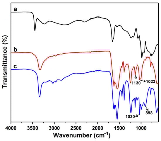 The FTIR spectra of urea phosphate, UF, and PSNP were shown in Figure 4. Curve a in Figure 4 showed that the FTIR spectrum of urea phosphate was consistent with the peak position reported by Abou Okeil et al., indicating the successful preparation of urea phosphate []. Curve b in Figure 4 showed the FTIR spectrum of UF, where the characteristic absorption peak at 1130 cm−1 could be attributed to the N-CH2-N asymmetric stretching vibration absorption peak in UF, while the characteristic absorption peak at 1023 cm−1 could be attributed to the C–O stretching vibration absorption peak in—CH2OH in UF. It could be observed that the ratio of characteristic absorption peak intensities of UF at 1023 cm−1 and 1130 cm−1, A1023/A1130, was significantly greater than the FTIR of UF prepared by Xiang et al. []. This indicated that at a higher ratio of formaldehyde to urea, the UF obtained had more terminated hydroxyl groups, which was very conducive to the esterification reaction between urea-formaldehyde oligomers and phosphates. As shown in curve c in Figure 4, the characteristic absorption peaks of PSNP at wavenumbers 1030 cm−1 and 898 cm−1 could be attributed to P-O bond symmetric and asymmetric stretching vibration absorption peaks, respectively, indicating the presence of many phosphate ester bonds in the PSNP molecule, confirming that PSNP indeed had the structure shown in Figure 2. On the other hand, by comparing curves b and c in Figure 4, PSNP did not exhibit a corresponding C-O stretching vibration absorption peak in—CH2OH at a wavenumber of 1023 cm−1, indicating a higher reaction degree between terminal hydroxyl groups of urea formaldehyde oligomers and phosphate, indirectly reflecting a higher yield of PSNP.