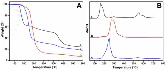TG curves (A) and DTG curves (B) of urea phosphate (a), UF (b), and PSNP (c).
