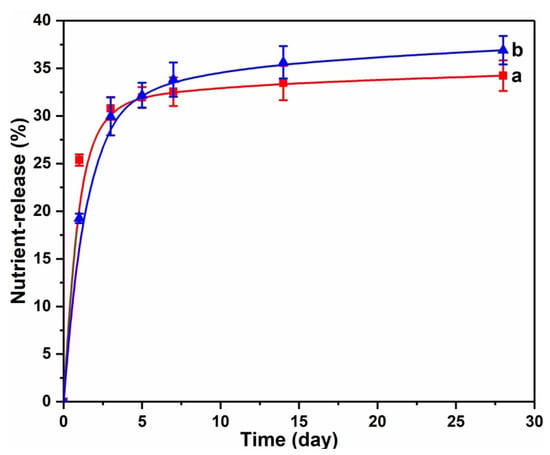 Urea phosphate is easily soluble in water, and its N and P nutrients are both available nutrients []. From Figure 7, the release rate of N and P nutrients in the PSNP prepared by the condensation of urea phosphate and urea formaldehyde oligomer is relatively slow in the soil, indicating that it is a slow-available nutrient. In 0~5 days, the slow-release rate of N and P in PSNP was faster. This was because PSNP contains a certain number of small molecules and oligomers, which were more easily soluble in water. Therefore, after being applied to the soil, the soluble components in PSNP first dissolved in the soil solution and quickly released to the outside. After 5 days of degradation, the release of N and P nutrients in PSNP tended to flatten out. By the 30th day, the cumulative release rates of N and P were 34.23% and 36.91%, respectively. This indicated that the slow release of P nutrients will be greatly improved after phosphate polymerization into the urea formaldehyde molecular chain, which will greatly help to improve the P nutrient utilization efficiency of fertilizers. The molecular structure of PSNP was basically the same as that of fertilizer (PSRF/KCl) prepared by Li et al., the nitrogen release rate of PSNP was significantly higher than that of PSRF/KCl (less than 5%) []. However, in general, plants have a great demand for nitrogen during the whole growth period, so PSNP has better slow-release performance for N and P in soil.