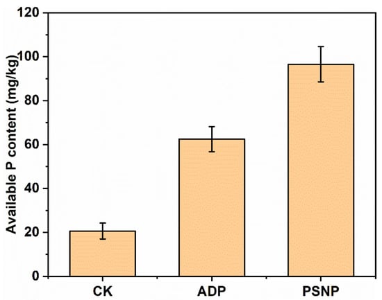 The effects of each treatment on soil available P are shown in Figure 8. The content of available P in soil fertilized with ADP and PSNP was 62.47 mg/kg and 96.54 mg/kg, respectively. The results showed that PSNP fertilizer could promote soil available P content. Because P in PSNP fertilizer has a good slow-release effect, its slow-release process can reduce the fixed amount of metal cations in the soil. In addition, the UF segment in PSNP would be broken in the degradation process to form many medium or small molecular fragments, namely UF fragments, which will form stable complexes with high-valence metal ions, and the complexes can reduce P fixation and facilitate P migration in soil and uptake by crops []. Obviously, the use of PSNP is a feasible method to improve P nutrition in agricultural soil.