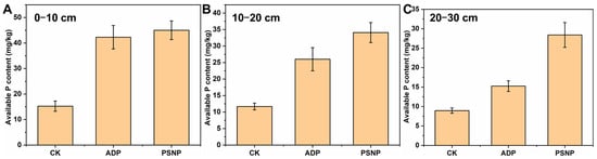 Use of PSNP significantly promoted the vertical migration ability of P nutrients and enhanced the available P level in soil. The migration data showed that the soil available P content under PSNP treatment was about twice that under ADP treatment in the 20–30 cm soil layer.