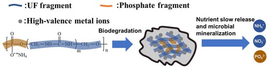 Urea formaldehyde is the most widely used slow-release polymer nitrogen (N) fertilizer []. It can be slowly degraded and release N nutrients under the action of microorganisms []. Its N nutrient content is very high, usually more than 30%, and it is an efficient N fertilizer for improving crop yield and quality []. In addition, the urea formaldehyde molecular chain contains active groups (hydroxyl and amide groups, etc.), which provide the possibility for further modification []. Wang et al. used potassium dihydrogen phosphate and urea-formaldehyde prepolymers for copolymerization to prepare polymer fertilizer that can slow-release P and potassium nutrients []. However, the preparation process needed to be carried out at high temperature, which will result in high manufacturing cost, and high temperature reaction process may generate biuret harmful to the plant []. Therefore, it is necessary to further improve the preparation method and use a simple and environmentally friendly process to prepare polymer fertilizer that can release N and P slowly.