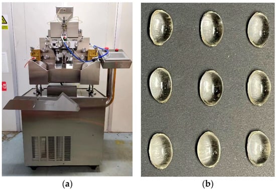 (a) soft capsule machine (HSR-60, Beijing, China) and (b) soft capsules prepared in this work.