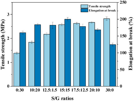 The reliable mechanical properties of polysaccharide film are crucial to produce high quality soft capsules [9]. Therefore, the effect of different mass ratios between sorbitol and glycerol on the mechanical properties of pullulan soft films are studied, and the results are shown in Figure 2. With the increase in the mass ratio of S/G, the tensile strength of the pullulan soft film improves quickly, but the intensified effect on the tensile strength is no longer obvious after the ratio of S/G passes 15:15. Meanwhile, the growth of the mass ratio of S/G also affects the elongation at break, which increases gradually before the mass fraction of glycerol below half in the plasticizer mixture, and then the elongation at break decreases after that. The reason may be that sorbitol has a longer molecular chain compared to glycerol at the same ratio between hydroxyl and carbon atoms, resulting in forming of a stronger combination between sorbitol and polysaccharide by hydrogen bonds, then increasing the tensile strength and elongation at break of pullulan soft film. However, an excessively high sorbitol content caused high crystallinity and phase separation, reducing the elongation at break of the pullulan soft films [32]. Moreover, Qunyi Tong et al. [19] has shown that the pullulan films without plasticizers exhibit high tensile strength of up to 68 MPA, but only have an elongation at break of 9.6%, suggesting a brittle structure. However, this work has found that the addition of a plasticizer mixture significantly increases the elongation at break of the film, particularly when the mass fraction of glycerol is equal to that of sorbitol. This factor is important because the pullulan film as ribbon may be broken by the rotating drum and the wedge during the encapsulation process. Although the pullulan soft film with only sorbitol as a plasticizer exhibits better tensile strength than the film with the plasticizer mixture, the difference is not significant when the S/G ratio exceeds 15:15.