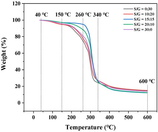 The thermogravimetric analysis (TGA) was used to evaluate the thermal stability of the pullulan soft films at different mass ratios of S/G, and the result is exhibited in Figure 4. The result shows the thermogravimetric curves of these pullulan soft films, which all have a similar thermal degradation behavior. There are three stages for the mass loss of the pullulan soft film during the heating process: the first stage, between 40 °C and 150 °C, is attributed to the evaporation of free water in the pullulan soft films; the second stage, between 150 °C and 260 °C, is attributed to the evaporation of combined water and plasticizer in the pullulan soft films; the third stage, between 260 °C and 600 °C, is attributed to the degradation of the plasticizers and polysaccharides. This trend is similar to that described by previous studies [30,34,35]. The result shows that the flection point of the pullulan soft film at the mass ratio of S/G of 15:15 has the highest temperature, and the flection point of most pullulan soft films with the plasticizer mixture is a higher temperature than that of the film with the single plasticizer. This fact proves that adding a plasticizer mixture can improve thermal stability of the pullulan soft film compared to adding a single plasticizer.