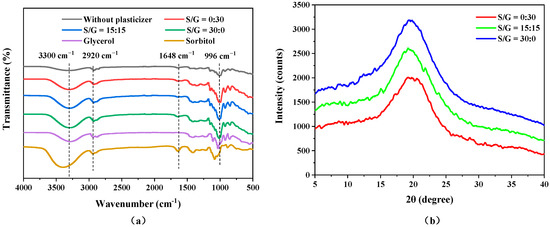 The functional groups of the pullulan soft films, without and with plasticizers, pure sorbitol, and pure glycerol, were investigated using Fourier transform infrared spectroscopy (FTIR), and the results of the FTIR spectra of the six materials are shown in Figure 5a. For the pullulan films, the characteristic peak near 996 cm−1 represents the stretching vibration of the glycosidic bond [27], while the absorption peak at 2920 cm−1 corresponds to the axial deformation of C-H, which may be caused by the absorption of symmetrical and asymmetrical stretching of -CH3 or even groups of -CH2 and -CHO [36]. A broad absorption peak near 3300 cm−1 is prominent due to the formation of hydrogen bonds by the interaction of O-H groups at the end of the pullulan soft film chains and in the plasticizers [33]. The main functional groups of glycerol are O-H and C-H, which appear at 3300 cm−1 and 2920 cm−1, respectively. The peak at 1648 cm−1 in the sorbitol spectrum is attributed to the stretching of the C=O bond. The FTIR spectra of the pullulan films indicate that the peak strengths at 3300 cm−1 and 996 cm−1 were enhanced after the addition of plasticizers, indicating that the addition of plasticizers strengthens the hydroxyl bond and glycosidic bond [37]. Moreover, the O-H peak becomes sharper with an increase in the mass ratio of sorbitol, possibly because the hydroxyl connections between pullulan and sorbitol are more sufficient than that with glycerol. Additionally, the results show that the three pullulan films with plasticizers display absorption peaks in similar areas, regardless of the different plasticizer forms and concentrations, demonstrating that all films had identical functional groups because even though the plasticizer types used during the film development are different, all of them are polyols [30].