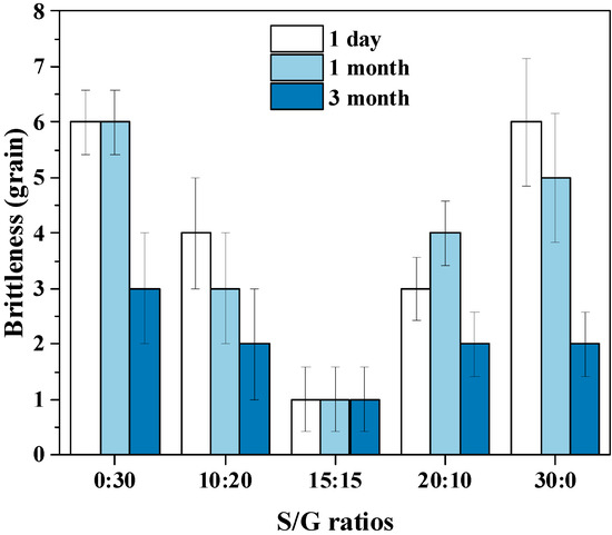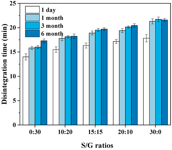 According to the requirements of the Chinese Pharmacopoeia (11th edition), one of the critical indicators of the soft capsule is that the soft capsule should be disintegrated within 60 min. Therefore, the pullulan soft capsules with various mass ratios of S/G and storage time were evaluated based on the disintegration time, and the results are shown in Figure 7. The result shows that the disintegration time of all plant soft capsules in this work is shorter than the limited time. Usually, the shorter disintegration time benefits quick drug release in the human body. The pullulan with a higher mass ratio of S/G has a longer disintegration time, and this can be explained by the above results that the hygroscopicity of sorbitol is lower than the glycerol. Hence, water molecules are difficult to penetrate the capsule, resulting in difficult disintegration. Moreover, with the increase in storage time in a stable environment, the disintegration time of the pullulan soft capsule becomes longer, especially for the film with pure glycerol. The reason for the increase in disintegration time of the capsule during storage may be due to the absorption of water vapor. As the capsule absorbs a certain amount of water vapor during storage, a water balance is achieved inside and outside the capsule. This absorption of water vapor also interact with the -OH groups in the capsule, resulting in a reduction in the number of available -OH groups [10]. Therefore, the disintegration liquid may not be able to penetrate the capsule as quickly without sufficient attraction from -OH groups and blockage of gaps by the absorbed water vapor, ultimately leading to an increase in disintegration time. However, compared with the requested disintegration time of 60 min, the effects of mass ratios of S/G and storage time on the disintegration time of the capsule are obscure.