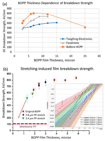 Polypropylene film is currently the most valued organic dielectric material in capacitor technology. Its advantages of having a low dielectric loss, high breakdown strength, ultra-thin thickness, and relatively low cost make it dominant in high-end technology applications such as new energy, high-speed railway transportation, high-voltage transmission, electric vehicles, oil exploration, aerospace, and electromagnetic weapons. Produced by stretching, biaxially oriented polypropylene film (BOPP) has gradually replaced paper dielectrics since the 1960s; after the 1980s, it became the main dielectric film for film/aluminum foil and metallized film capacitors [,]. Early studies found that the breakdown strength of BOPP increased as the thickness decreased in the range of 8–80 μm (μm) []. However, recent studies have found that the breakdown strength of BOPP reaches its highest value in the range of 5–15 μm, and the specific results depend on the test method and film manufacturing process [,]. The ever-increasing need in miniaturized electronic devices requires thinner dielectric films with high dielectric strengths for smaller volumes in capacitor modules [,,]. Polymer dielectrics, with the advantages of easy scaleup processing, a light weight, low cost, high dielectric strength, and good flexibility, offer a broad range of capacitance, a high voltage rating, graceful failure reliability, and self-clearing potential for capacitor manufacturing. For compact capacitors, it is critical to ensure that the film is as thin as possible and its dielectric strength as high as possible. Since the volumetric capacitance and therefore the volumetric energy density are inversely proportional to the dielectric film thickness, reducing the dielectric thickness is greatly beneficial. However, a further reduction in film thickness leads to a decrease in dielectric strength [,,]. The authors have been concerned about this thickness-dependent dielectric phenomenon because the decrease in breakdown strength due to thinning will become a huge challenge for capacitor miniaturization and high-voltage design []. The common breakdown mechanisms in polymeric materials include electron avalanche, thermal runaway, electromechanical failure, and long-term ionic migration. Polymer films containing various molecular chains, contaminants, interfaces, and surfaces can break down due to complicated factors. Unfortunately, most individuals who pay attention to thickness factors are capacitor design engineers.