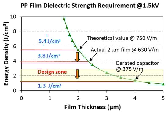 According to the formula for volumetric energy density (1/2ε0εV2/d2, where ε is the dielectric constant, V is the voltage, and d is the film thickness), the energy density increases significantly as the thickness decreases. Theoretically, BOPP is expected to achieve an energy density of over 5 J/cm3 (Figure 2). However, the breakdown strength of the film is limited at the working voltage, making it impossible to support higher theoretical energy densities. For a 2 µm thick BOPP film, the maximum breakdown strength tested was 630 kV/µm, but factors such as increasing the electrode area, process flow, and packaging density led to a decrease in the rated voltage, resulting in a decrease in the breakdown strength and energy density of the capacitor to 375 kV/µm and 1.3 J/cm3, respectively, or even lower (calculated based on a 60% reduction). With further thinning of the film (0.5–2 µm), the energy density of the capacitor can be expected to greatly decrease to less than 1 J/cm3 due to the significant reduction in breakdown strength (<400 kV/µm). Additionally, BOPP films are limited to low temperatures, and increasing the temperature would significantly reduce their breakdown strength []. Due to its low breakdown strength, ultra-thin BOPP films will lose their advantages in applications for capacitors.