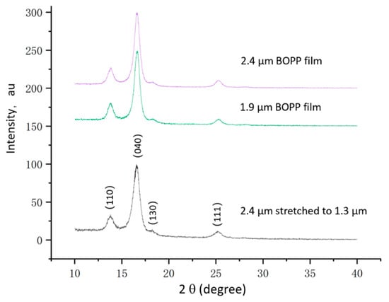 To understand the underlying reasons for this phenomenon, XRD and SEM analyses were used to characterize the semi-crystalline BOPP film and investigate the causes of the decrease in breakdown strength due to thinning. The tests showed that the BOPP films provided by Far Eastern New Century Corporation maintained a consistent crystal orientation regardless of thickness (Figure 3). The (040) diffraction peak located at 17 degrees exhibited the highest intensity and maintained a similar height and shape compared to the (110) peak during the thinning process (1.3 µm curve). This suggests that the stretching process did not disrupt the original biaxial crystal orientation of the BOPP. In addition, the thinning of the BOPP films did not lead to the appearance of the β-phase, indicating that the decrease in breakdown strength was not related to a phase transition [].