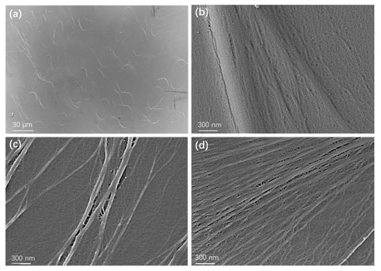 As is well known, defects such as contaminants in thick polymer films (over ten microns) play an important role in reducing breakdown strength. However, surface morphology and defects become more important as the film thickness decreases to a few microns. It is necessary to use SEM imaging technology to directly display the surface morphology and microstructure of thin film materials. Figure 4 shows that 2.4 µm thick BOPP undergoes changes as it is stretched thinner. Before stretching, the surface of the film exhibits a rough morphology and curved stripes generated during the film formation process (Figure 4a), with local areas showing uneven surfaces and fibers of varying thicknesses (Figure 4b). After the thickness is reduced to below 2.4 µm, the surface exhibits uneven, ridge-like fiber structures and non-dense regions. Figure 4c,d show nanometer-scale gaps and nanopores []. These defect features are likely the main reason for the sharp decrease in breakdown strength below 2.4 µm, as the breakdown strength of air is much lower than that of polymers, making it easy for ions to be ionized and discharged under high pressure. In fact, the breakdown strength of porous membranes is about 100 kV/mm or less (Figure 1). The presence of and increase in micropores directly reduces the breakdown strength of thin films. Suppressing micropores can help improve the dielectric breakdown strength of BOPP. Before high-temperature films become available, once BOPP films no longer have the advantage of a high breakdown strength, the goal of miniaturizing capacitors will be difficult to achieve.