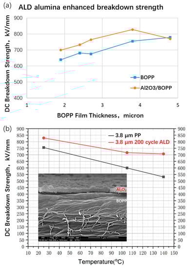 (a) Effect of ALD alumina coating on breakdown strength of BOPP films of various thicknesses; (b) breakdown strength enhancement at higher temperatures and SEM images of cross section of coated 3.8 µm BOPP.