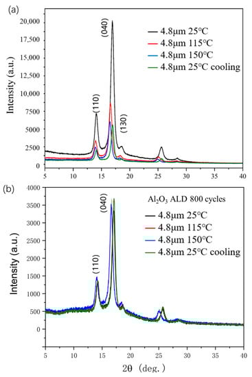 Effect of in situ heat treatment (115, 150 °C for 30 min) on XRD patterns of BOPP (a) and ALD-alumina-coated BOPP (b).