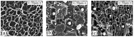 SEM photographs of the transversal section of hydrogel samples. Composite formulation HEMA:PVP:H2O (mass parts): (a) 80:20:0; (b) 80:20:0, [Zn] = 5 wt.%; (c) 80:20:50, [Zn] = 5 wt.%.