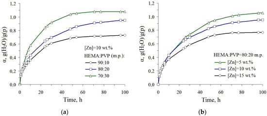 Effect of composite formulation (a) and metal content (b) on the swelling kinetics of Zn/pHEMA-gr-PVP copolymers in water.